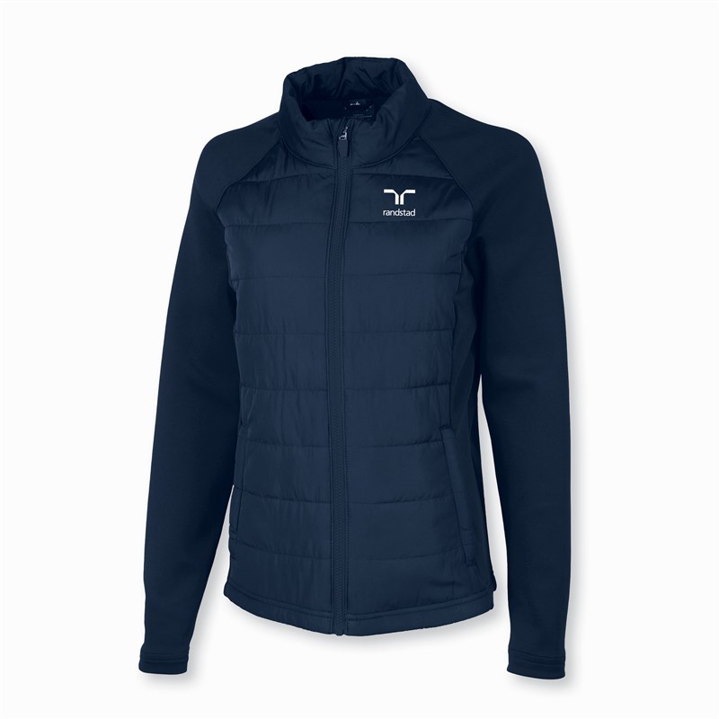 The Women's Lotus Hybrid Jacket offers lightweight insulation and flexible side panels. Designed for warmth, comfort, and a flattering silhouette. Perfect for travel or outdoor corporate events. Embroidered with the Randstad Stacked Logo, it upholds professional branding with sophistication.